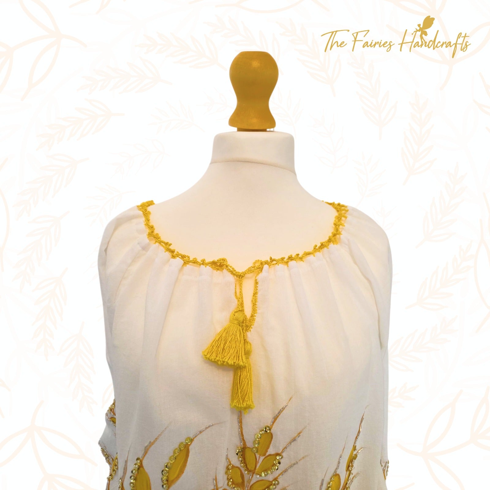- Hand-painted golden wheat motifs, embellished with beads and sequins