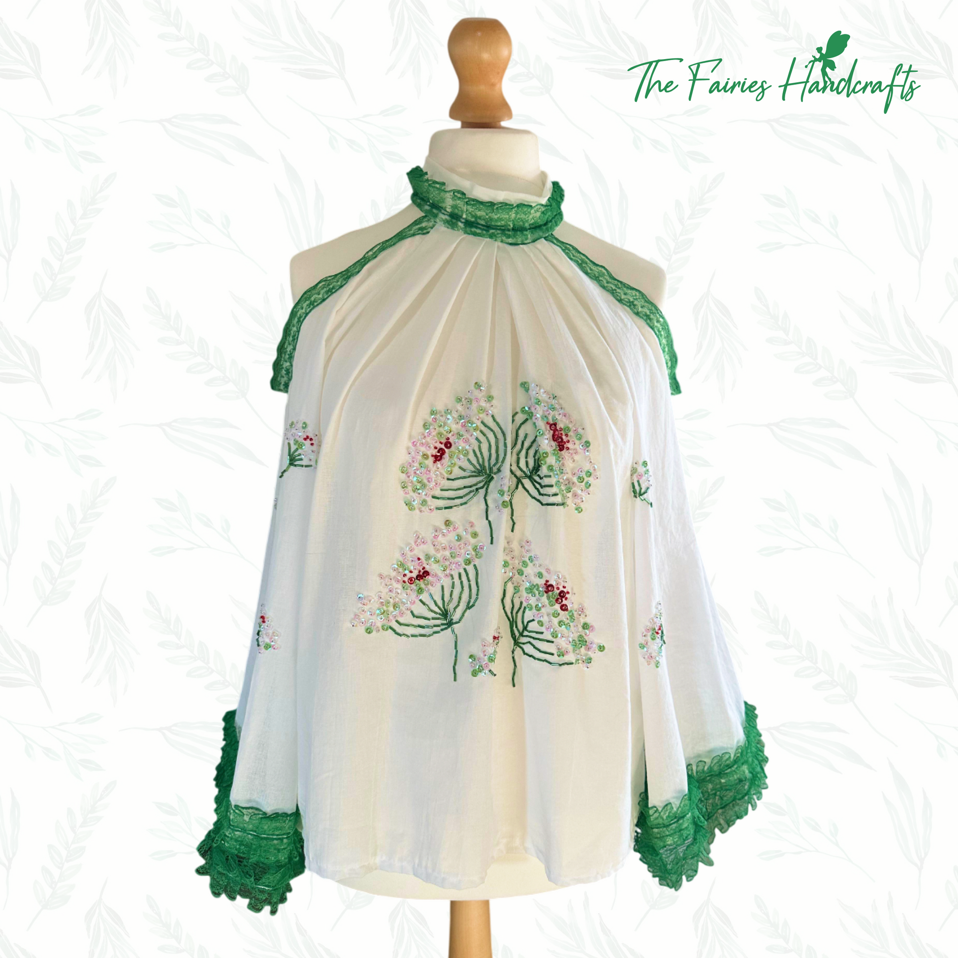 Every stitch is placed by hand, turning this blouse into a piece of art that both honours and questions cultural values — a dialogue between past and present, innocence and modernity.
